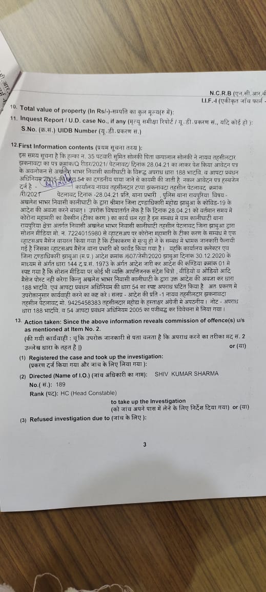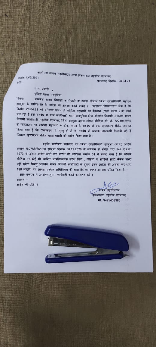 इन दिनो कोरोना के टीकाकरण का अभियान चल रहा है पूरा प्रशासन कोरोना कर्फ्यू के पालन के साथ टीकाकरण करवाने के लिए भी लोगो को प्रेरित कर रहा है ऐसे में कोरोना के टिका को लगाने पर मृत्यु हो जाने संबंधी पोस्ट शोशल मीडिया के प्लेटफॉम पर बिना सोचे समझे भ्रामक सन्देश कुछ लोग वाइरल कर देते है इसी तरह का एक भ्रामक सन्देश अखलेश भाबर निवासी कालीघाटी ने व्हाटसअप पर इस तरह का भ्रामक सन्देश वाइरल कर दिया है । थाना प्रभारी तेजमल पँवार ने तहसीलदार जगदीश वर्मा के आवेदन पर आरोपी अखलेश पर धारा 188 तथा आपदा प्रबंधन एक्ट के तहत अपराध पंजीबद्ध कर लिया है पेटलावद एसडीएम शिशिर गेमावत ने झाबुआ लाइव के माध्यम से अपील कर बताया है कि कोई भी व्यक्ति इस तरह के भ्रामक संदेशों को शोशल मीडिया पर वायरल नही करे इस तरह के सन्देश झूठे है इन्हें वाइरल करने वाले ऐसे व्यक्ति पर कठोर कार्यवाही होगी उन्होंने कहा कि वेक्सीन सुरक्षीत है और इसके लगने के बाद शरीर मे कोरोना से लड़ने के लिए एंटीबाडी बनती है उन्होंने कहा मेने भी कोरोना का टीका लगवाया है ये पूरी तरह सुरक्षीत है उन्होंने कहा है आप वेक्सीन लगवाए खासकर 18 साल से अधिक उम्र के युवाओं से 1 मई से लगने वाले टीकाकरण में टिका लगवा कर देश को कोरोना की जंग से जीतने में सहयोग करने की अपील की है ।