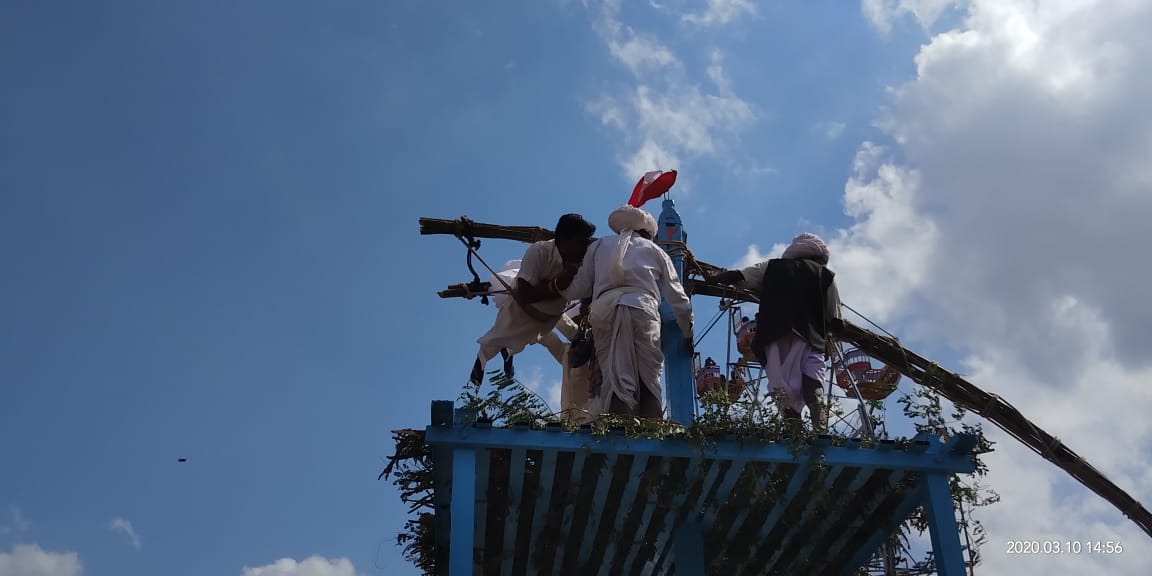 40 फिट ऊंचाई पर गल देव के चक्कर लगाकर ग्राम की सुख शांति के लिए प्रार्थना करते सरपंच सुखराम मेड़ा