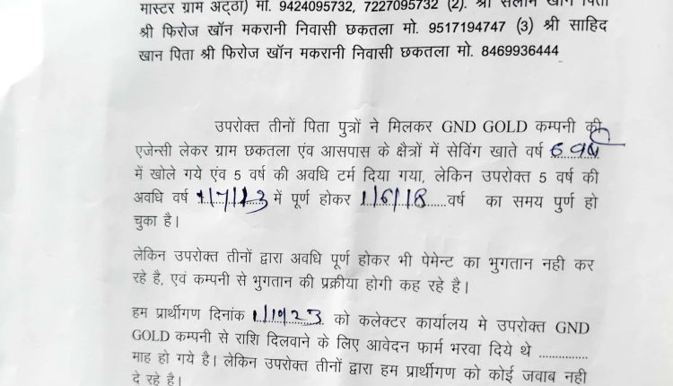 छकतला। जीएनडी गोल्ड कंपनी में रुपए जमा करने वाले लोगों ने जनसुनवाई में आवेदन देकर रुपए दिलाने की मांग कलेक्टर से की। आवेदन में ग्रामीणों ने बताया फिरोज खान पिता दीलावर खॉन मकरानी निवासी छकतला, सलीम खान पिता फिरोज खान मकरानी निवासी छकतला और शाहीद खान पिता फिरोज खान मकरानी तीनों पिता-पुत्रों ने मिलकर जीएनडी गोल्ड कंपनी के नाम पर छकतला एवं आसपास के क्षेत्रों में जाकर ग्रामीणों के सेविंग खाते खोले थे। उन्होंने 5 वर्ष की अवधि का टर्म दिया था। लेकिन 6 वर्ष होने के बाद भी राशि नहीं दी जा रही। पेमेंट का भुगतान नहीं होने से ग्रामीणों ने कलेक्टर से जनसुनवाई में गुहार लगाई है। उन्होंने जनसुनवाई में आवेदन देकर रुपए दिलाने की मांग करते हुए मामले में कार्रवाई की मांग की है।