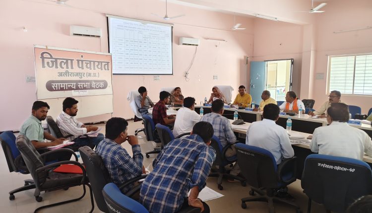 आलीराजपुर। जिला पंचायत अध्यक्ष हजरी बाई खरत की अध्यक्षता में जिला पंचायत की सामान्य सभा की बैठक का आयोजन जिला पंचायत के सभा कक्ष में आयोजित की गई। इस बैठक में श्रीमती खरत ने पंचायत एवं ग्रामीण विकास विभाग , लोक स्वास्थ्य यांत्रिकी  विभाग, म.प्र.प.क्षे.वि.विकली की समीक्षा ,प्रधानमंत्री ग्राम सड़क योजना की समीक्षा की गई।