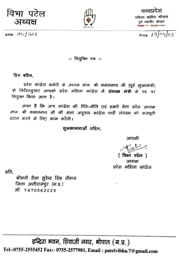 मध्यप्रदेश में 6 महीने बाद होने वाले विधानसभा चुनाव के पहले कांग्रेस अपने संगठनो में कसाव लाने की कोशिश में जुटी है इसी कड़ी में प्रदेश महिला कांग्रेस में संगठन मंत्री पद पर अलीराजपुर की कांग्रेस नेत्री रीना चौहान को महिला कांग्रेस की प्रदेश इकाई में संगठन मंत्री का दायित्व सौंपा गया है .. प्रदेश महिला कांग्रेस अध्यक्ष विभा पटेल ने प्रदेश अध्यक्ष कमलनाथ की सहमति से यह नियुक्ति की है .. इस नियुक्ति पर अलीराजपुर जिले के कांग्रेस नेताओं विधायक मुकेश पटेल,पूर्व जिलाध्यक्ष महेश पटेल,कार्यवाहक जिला अध्यक्ष खुर्शीद दिवान, सेना पटेल,महिला जिला अध्यक्ष हजरी अजनार,सुरपाल अजनार,उसान भाई, कामरु अजनार,अमान पठान,महेंद्र रावत,जितु अजनार, अरविंद डावर,सुनील खेड़े,राजेश जैन,मयंक सोनी,हरीश भाभोर,लईक शेख,हनीफ़ एडवोकेट, आदिल शेख,भारतसिंह जाधव,पारसिंग बारिया,वरसिंह बारिया,रमेश पटेल सरपँच,फेतेहसिंग कछवाह ने रीना चौहान को बधाई देते हुए हर्ष व्यक्त किया एंव नेतृत्व का आभार माना ।
