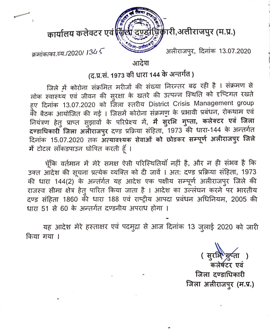 कलेक्टर श्रीमती गुप्ता ने आज 13 जुलाई से 15 जुलाई तक आलीराजपुर जिले को पूरी तरह लॉकडाउन (completely lockdown) करने के आदेश जारी कर दिए गए हैं। आदेश में साफ कहा गया है कि अब जिले में पूरी तरह से लॉकडाउन रहेगा। ऑफिशियल होम डिलिवरी के अलावा बाकी सभी दुकानें बंद रहेंगी। इस दौरान होम डिलिवरी, दूध पार्लर और दवा की दुकानें खुली रहेंगी।
