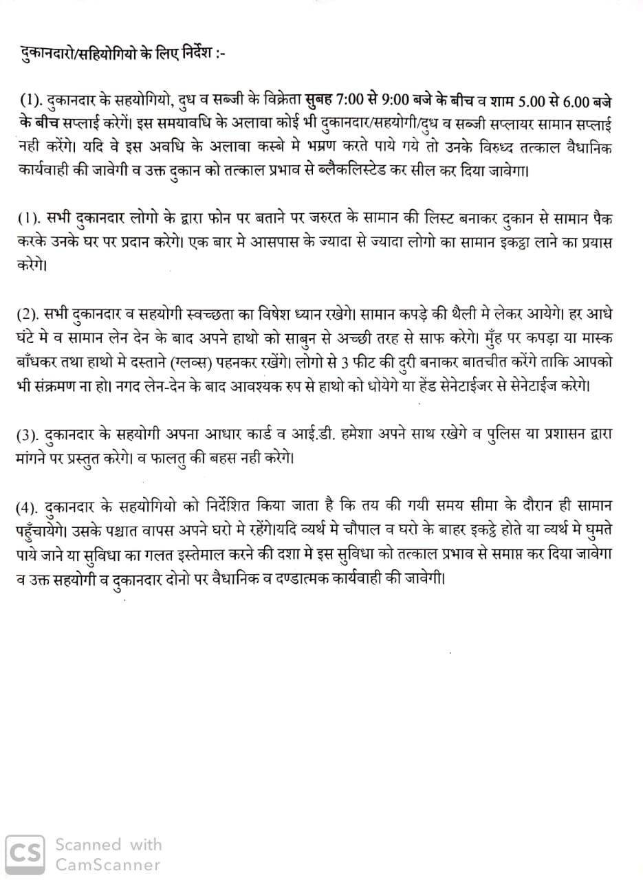 कल सुबह बाजार में किसी भी प्रकार की भीड़ ना दिखाई दे। कल सुबह यदि कोई भी व्यक्ति बाजार में सामान खरीदते व बेचते पाया जाता है तो वीडियो बनाकर उनके विरुद्ध एफआईआर की जाएगी। निर्देशों का सख्ती से पालन करें। दूध व सब्जी विक्रेताओं को बता दिया गया है कि वे पूरे कस्बे में भ्रमण कर दूध व सब्जी बेचेंगे।