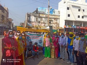 अलीराजपुर। जिला मुख्यालय के प्रथम भोंगर्या हाट में आदिवासी समाज अलीराजपुर के द्वारा स्थानीय टंट्या भील मामा चोराहे पर एकत्रित हुये,जहां से आदिवासी समाज जन द्वारा स्थानीय न्यू बस स्टैंड तक कोरोना वायरस से बचाव की अपील करते हुए जनजाग्रति भोंगर्या हाट की सांकेतिक गैर निकली गई। गैर में एक ऑटो को कोरोना संक्रमण से बचाव रथ के रूप में तैयार किया था, जिसके माध्यम से भोंगर्या हाट में आये ग्रामीणों से अपील की गई की कोरोना वायरस को भगाना है, देश को बचाना है। सतर्कता ही बचाव है, मास्क, सेनिटाइजर एवं छः गज की दूरी का पालन करना है। शासन द्वारा 60 वर्ष से अधिक समस्त एवं 45 वर्ष से अधिक बीमारी से ग्रषित व्यक्तियों को निःशुल्क टीका नजदीक के अस्पताल में जाकर लगाने की अपील की गई है। साथ ही भीड़-भाड़ वाली जगह में जाने से बचने, सोशियल डिस्टेंटिंग का पालन करने तथा बार-बार हाथ धोने एवं सेनिटाइजर का उपयोग करने के लिए एवं व्यापारी वर्ग से भी सतर्कता बरतने के लिए आह्वान किया गया। आदिवासी समाज के महिला एवं पुरुषों द्वारा आदिवासी पारम्परिक वेश भूषा में तैयार होकर कोरोना गाइड लाईन का पालन करते हुये संदेश के साथ गैर निकाली गई। इस वर्ष परम्परा गत डोल, मांदल से गैर नहीं निकाल कर शासन-प्रशासन की गाइड लाईन का पालन करते हुए सहयोग का परिचय दिया। इस अवसर पर आदिवासी कर्मचारी-अधिकारी संगठन (आकास), अजाक्स, महिला मंडल, जय आदिवासी युवा शक्ति (जयस), आदिवासी छात्र संघ (एसीएस) एवं आदिवासी समाज के विभिन्न संगठनों के सदस्य एवं समाजजन सम्मिलित हुये।