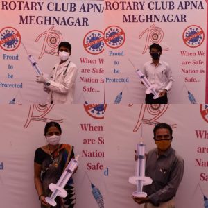 रोटरी क्लब द्वारा वैक्सीन सेंटर पर सेल्फी प्वाइंट का शुभारंभ मेघनगर के डॉ विनोद नायक मुख्य कार्यपालन अधिकारी विकास डावर रोटरी क्लब 3040 के स्वस्थ्य चेयरमैन भरत मिस्त्री असिस्टेंट गवर्नर मांगीलाल नायक एवं रोटरी अपना के अध्यक्ष पंकज राका द्वारा किया गया।कोरोना के वैक्सीनेशन के उत्साह में कुल 101 व्यक्तियों ने टीका महोत्सव के प्रथम एवं द्वितीय दिवस लोगों ने संजीवनी का टीका लगवाया। लोग घरों से खुशी-खुशी कोरोना का टीका लगवाने केंद्रों पर पहुंचे और अपनी बारी का पूरा इंतजार कर टीका लगवाया। टीका लगवाने के बाद उनहे चेहरे पर उत्साह साफ झलक रहा था रोटरी क्लब द्वारा सेल्फी प्वाइंट एवं हाथों में कोविड-19 शिल्ड इजेक्शन का निशान हाथों में लेकर फोटो भी लोग खिंचवा रहे थे। रोटरी क्लब अपना ने मेघनगर सरकारी अस्पताल में टीकाकरण के बाद सेल्फी प्वाइंट पर फोटो खिंचवाने वालों की होड़ दिखी। इससे साफ था कि कोरोना खत्म करने की संजीवनी लेने के लिए अब लोगों का उत्साह बढ़ गया है।वहीं बच्चे भी अब टीकाकरण को लेकर संदेश दे फेसबुक वॉल व सोशल मीडिया पर सेल्फी फोटो डाल रहे हैं।