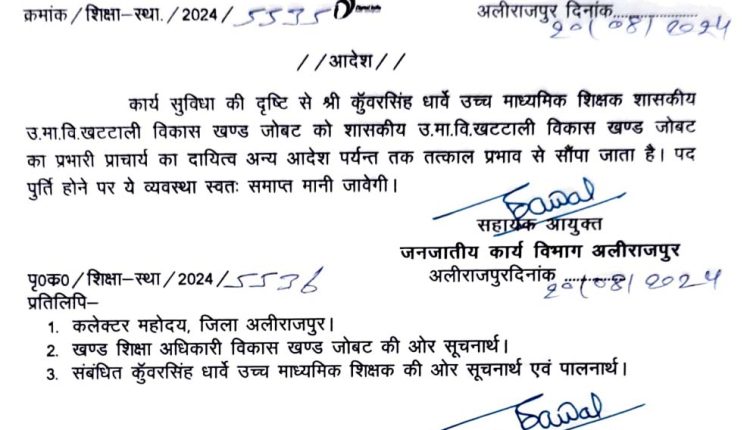 सीनियर शिक्षक कुंवर सिंह धार्वे को पीएमश्री शासकीय उच्चतर माध्यमिक विधालय खट्‌टाली का प्रभारी प्राचार्य बनाया गया है। इसके आदेश मंगलवार को जनजातीय कार्य विभाग के प्रभारी सहायक आयुक्त संजय परवाल ने आदेश जारी किए। अब तक यह पद प्रवीण प्रजापत संभाल रहे थे। उनके पास बीआरसी का प्रभार भी है। हालांकि स्वास्थ्य कारणों के चलते वे लगभग 20 दिनों से अवकाश पर है।