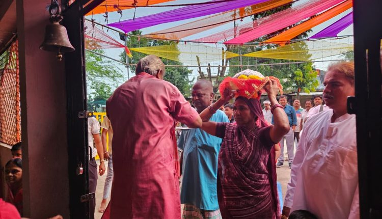 खरडू बड़ी। झाबुआ जिले के गांव खरडू बड़ी में मुकेश गोयल द्वारा नवरात्रि के पावन पर्व पर नवरात्रि के प्रथम दिन पर चामुंडा माता मंदिर पर 500 ग्राम चांदी का छत्र माता जी को भेंट किया गया।जिसका मंदिर के पुजारी राजेश महंत द्वारा पूजा अर्चना कर माताजी को भेंट किया गया जिसमें समस्त ग्रामीणजन एवं गोयल परिवार उपस्थित रहा।