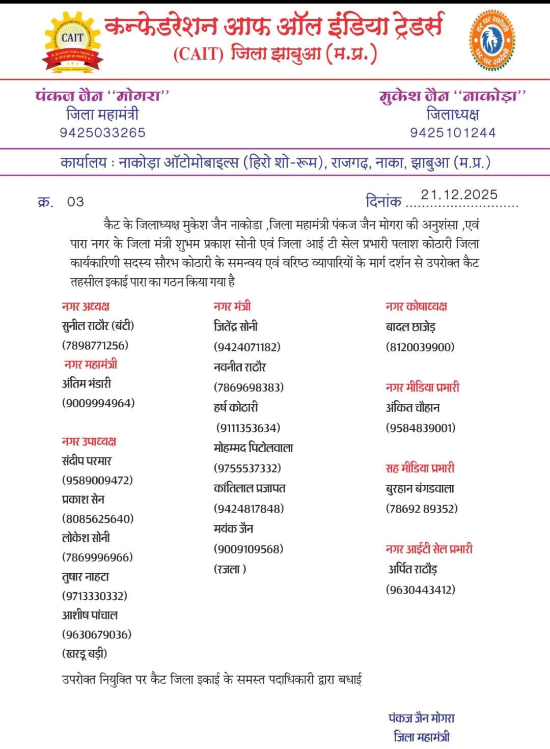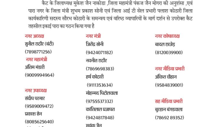 कन्फेडरेशन ऑफ ऑल इंडिया ट्रेडर्स CAIT के जिलाध्यक्ष मुकेश जैन नाकोडा एवं जिला महामंत्री पंकज जैन मोगरा की अनुशंसा एवं जिला मंत्री शुभम सोनी, जिला आईटीसी प्रभारी पलाश कोठारी एवं जिला कार्यकारिणी के सदस्य सौरव कोठारी के समन्वय से तहसील इकाई पारा का गठन किया गया संगठन के मीडिया प्रभारी अंकित चौहान ने बताया कि रविवार को हुई पदाधिकारियों की घोषणा में पारा के युवा उद्यमी सुनील राठौड़ बंटी को नगर का अध्यक्ष तो अंतिम भंडारी को नगर महामंत्री बनाया गया वहीं संदीप परमार,प्रकाश सैन,लोकेश सोनी,तुषार नाहटा,आशीष पांचाल खरडू बड़ी को उपाध्यक्ष नगर मंत्री जितेंद्र सोनी,नवनीत राठौड़,हर्ष कोठारी,मोहम्मद पीटोलवाला,कांतिलाल प्रजापत,मयंक जैन रजला कोषाध्यक्ष बादल छाजेड,मीडिया प्रभारी अंकित चौहान, सह मीडिया प्रभारी बुरहान बंगड़वाला,आईटी सेल प्रभारी अर्पित राठौड़ को बनाया गया। साथ ही साथ जिला अध्यक्ष जैन ने कैट की तहसील इकाई पारा की नवगठित समिति के गठन पर समस्त पदाधिकारियों एवं सदस्यों को हार्दिक बधाई एवं शुभकामनाएँ देते हुए बताया कि हमें पूर्ण विश्वास है कि यह समिति व्यापारी हितों की रक्षा, संगठन को सशक्त बनाने तथा क्षेत्र के व्यापारियों की समस्याओं के समाधान हेतु पूरी निष्ठा, समर्पण एवं सक्रियता से कार्य करेगी।