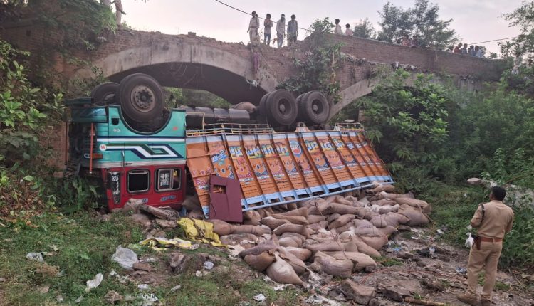 चावल से भर कर जा रहा ट्रक पुल से नीचे गिरा