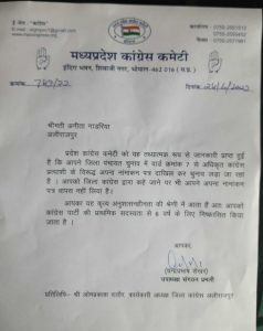 । जिला कांग्रेस कार्यवाहक अध्यक्ष ओम राठोड ने प्रदेश कांग्रेस को इनके द्वारा पार्टी गाइडलाईन से हटकर जिला पंचायत सदस्य के चुनाव में अधिकृत प्रत्याशी हजरी अजनार के खिलाफ बागी होने की शिकायत की थी । इसी के चलते प्रदेश कांग्रेस कमेटी ने आज इन्हे 6 साल के लिये निष्कासित कर दिया है ।
