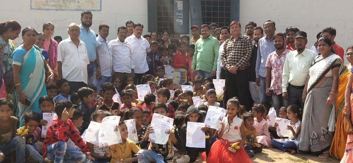 कांग्रेसी नेताओ ने स्कुली बच्चो को फल-बिस्कुट विरतण किए