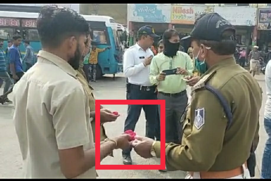 नये साल मे ट्रेफिक पुलिस का नवाचार ; ड्रेस कोड मे आये चालक परिचालको को गुलाब ओर ना पहनने वालो का चालान