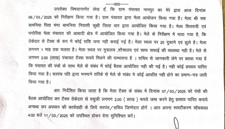 दरअसल, सीईओ गोपाल प्रजापति ने गुरुवार को मेला स्थल का निरीक्षण किया था। इस दौरान पाया गया कि एक माह चलने वाले इस मेले के लिए ग्राम पंचायत ने टैक्स वसूली नहीं की है। इस मेले से लगभग 2 लाख रुपए टेक्स मिलने की संभावना है। पत्र में सीईओ निर्देश दिए कि मेला टेक्स के संबंध में 7 मार्च को पंचाें की बैठक आयोजित कर करीब 2 लाख रुपए टैक्स मेले के ठेकेदार से वसूली करने का प्रस्ताव पारित किया जाए। अन्यथ अपव्यन की कार्रवाई के लिए सरपंच, सचिव जिम्मेदार होंगे। नोटिस में ग्राम पंचायत से 11 मार्च तक स्पष्टीकरण मांगा गया है।