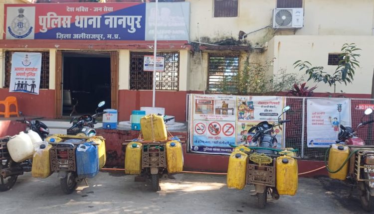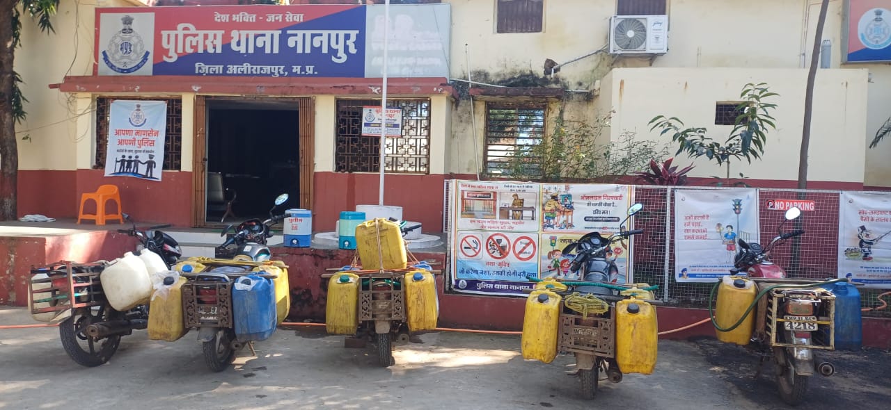 आलीराजपुर जिले के नानपुर में एसपी रघुवंश सिंह के निर्देशन में थाना प्रभारी ने नकली ताड़ी बेचने वालों पर कार्रवाई की। पुलिस ने लगभग 600 लीटर नकली ताड़ी जब्त की। यह पांच मोटर साईकिल पर ले जाई जा रही थी। नानपुर थाना प्रभारी राजेश  डावर ने बताया कि नानपुर में जो भी अवैध रूप से व्यापार किये जा रहे है उन पर भी कार्रवाई की जाएगी। कार्रवाई से अवैध रूप से ताड़ी का व्यापार करने वालों में हड़कंप मच गया।