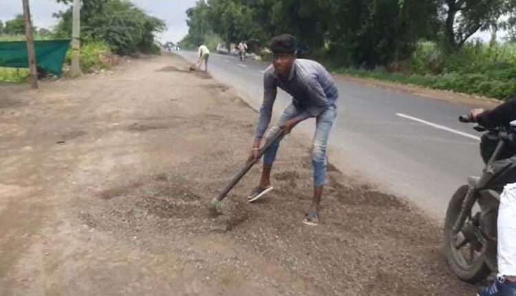 खबर प्रकाशित होने के सड़क की साइड पट्‌टी भरने पहुंचे मजदूर