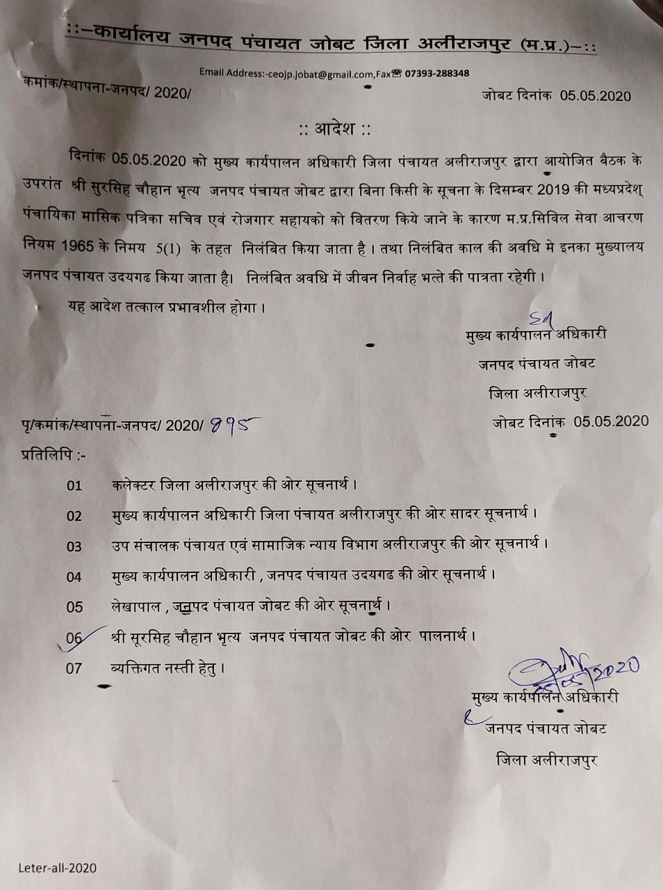 – आज जनपद जोबट मे जिला पंचायत सीईओ सुदीप मालवीय द्वारा रोजगार गारंटी सचिवों की आयोजीत मीटिंग मे जनपद सीईओ पटेल के निर्देश पर चतुर्थ श्रेणी कर्मचारी सुरसिंह द्वारा पूर्व मुख्यमंत्री कमलनाथ के पत्रक बाटे गये, जिस पर भाजपा नेता राकेश अग्रवाल द्वारा आपत्ति ली गई , जिसके तत्काल बाद जिला मुख्य कार्यपालन अधिकारी ने भृत्य सुरसिंह को तत्काल सस्पेंड कर दिया।