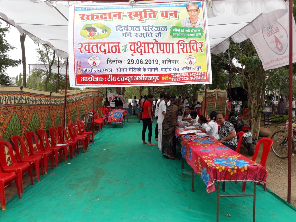 अलीराजपुर में जिला चिकित्सालय के सामने दाहोद रोड पर आज टीम रक्तदुत के द्वारा रक्तदान सह वृक्षारोपण शिविर का भव्य आयोजन किया गया। शिविर में नगर के 70 परिवारों ने अपने दिवंगत परिजनों की स्मृति में आम, नीम, पीपल, पाम ट्री, शिसम आदि विभिन्न प्रकार के पौधों का रोपण किया। सर्वप्रथम कार्यक्रम की शुरुआत नगरपालिका अध्यक्ष सेना पटेल, कांग्रेस के जिलाध्यक्ष महेश पटेल, डॉ. के. सी. गुप्ता, डॉ. आर. मंडल व डॉ. प्रमेय रेवड़ियां द्वारा स्व. मदन मोहन पंचोली के चित्र पर माल्यार्पण कर की गई, तत्पश्चात नगर के गणमान्य नागरिकों की उपस्थिति में टीम रक्तदुत के सदस्यों तथा अन्य लोगो ने वृक्षारोपण किया। इसके साथ ही टिम रक्तदूत व जिला अस्पताल के स्टॉफ के सहयोग से रक्तदान शिविर भी आयोजित हुआ जिसमें 35 महिलाओं तथा 33 पुरुष सहित कुल 68 यूनिट कलेक्शन हुआ। उक्त शिविर के आयोजन के लिए टीम रक्तदुत व आयोजनकर्ता परिवार की नगर वासियो ने प्रशंसा की।
