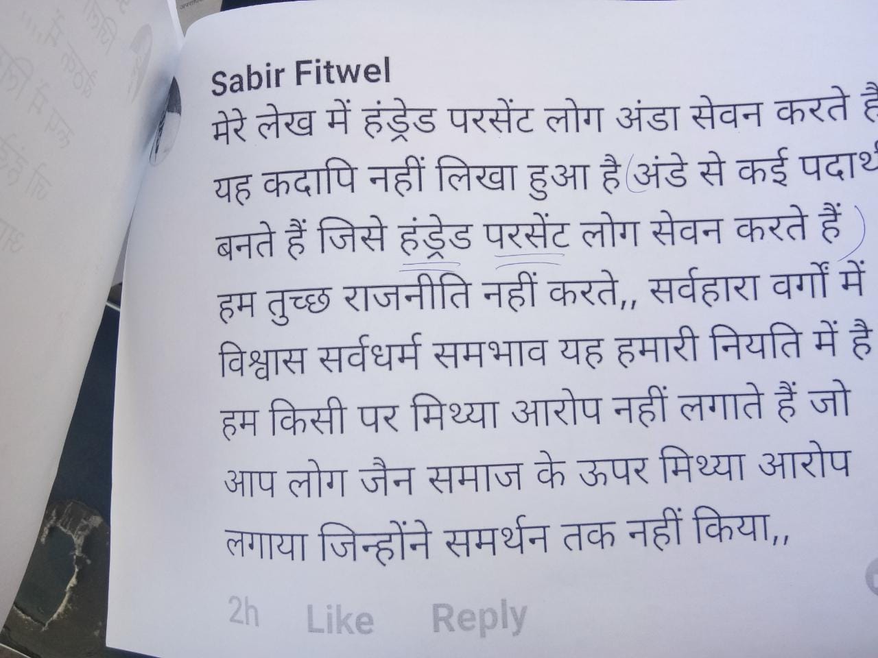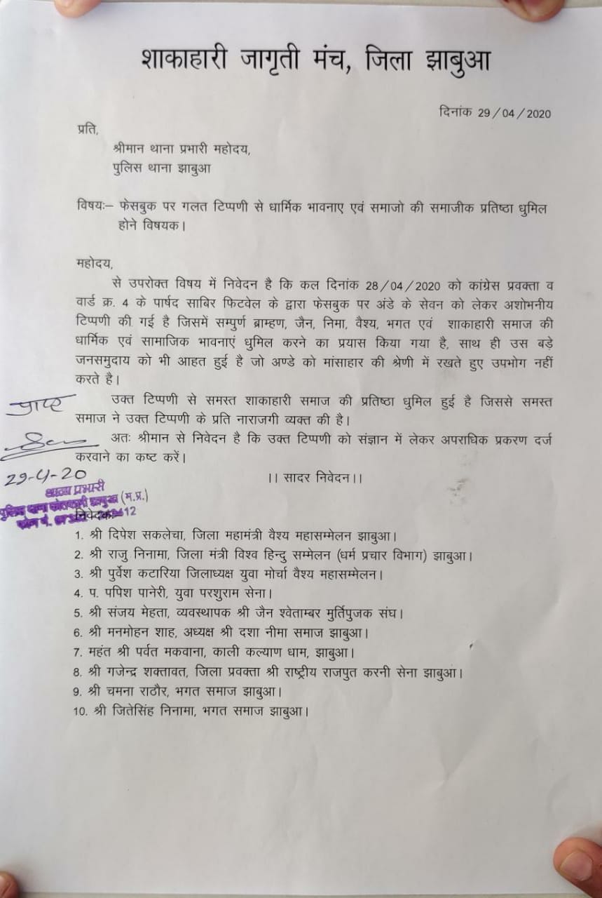 इसके बाद आज जेन समाज और ब्राह्मण समाज के कुछ लोगो ने साबिर फिटवेल के खिलाफ आवेदन दिया है। जिसमे बताया गया कि साबिर फिटवेल द्वारा फेसबुक पर अंडे के सेवन को लेकर अशोभनीय टिप्पणी की गई जिसमें संपूर्ण ब्राह्मण, जैन, नीमा वैश्य, भगत एवं शाकाहारी समाज के धार्मिक एवं सामाजिक भावनाएं धूमिल करने का प्रयास किया गया है। इसके साथ ही एक बड़े जनसमुदाय को भी आहत हुई है, जो अंडे को मांसाहार की श्रेणी में रखते हुए उपभोग नहीं करते है। सभी फिटवेल की इस टिप्पणी को संज्ञान में लेकर सभी ने मांग की है कि उन पर अपराधिक प्रकरण दर्ज किया जाए हालांकि पुलिस ने मामले को जांच में ले लिया है और आगे की कार्रवाई की जा रही है।