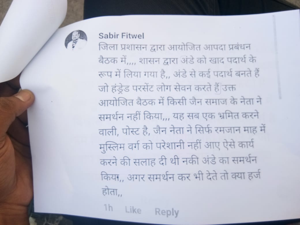 कल कलेक्टोरेट में जिला आपदा प्रबंधन की बैठक आयोजित हुई थी। जिसमें कांग्रेस प्रवक्ता वह वार्ड क्रमांक चार के पार्षद साबिर फिटवेल के द्वारा रमजान माह के चलते अंडे पर लगे बैंड को हटाने का प्रस्ताव रखा था जिसका मौन समर्थन कांग्रेस के जिला अध्यक्ष निर्मल मेहता ने किया था इसके बाद सोशल मीडिया पर इसी को लेकर आलोचनाएं हुए इसके बाद साबिर फिटवेल ने एक पोस्ट डाली और बताया कि निर्मल जैन ने अंडे का पूर्ण समर्थन नही दिया था और अंडे से कई ऐसी चीजें बनती है, जिनका शत-प्रतिशत लोग सेवन करते है।