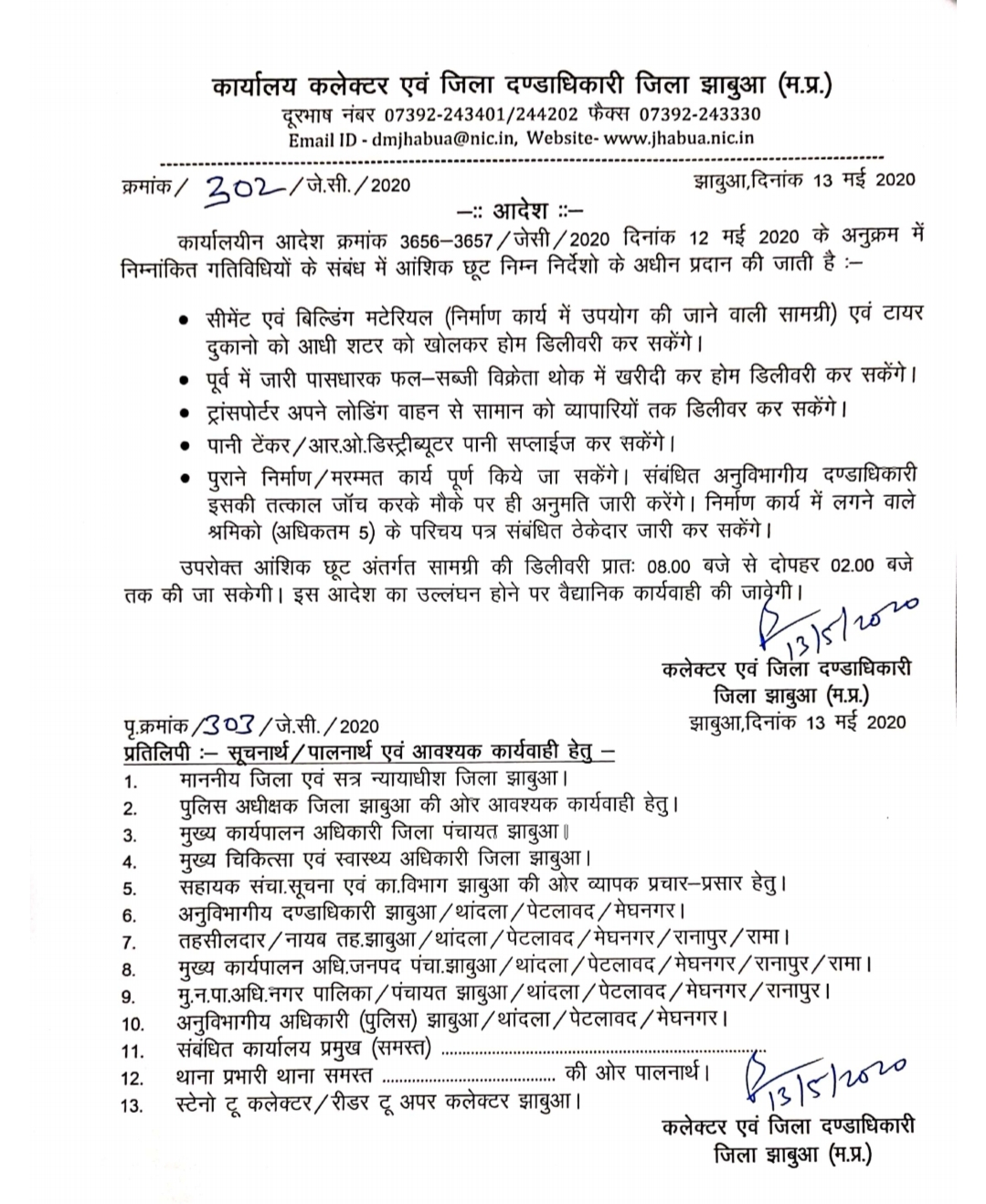 आज फिर कलेक्टर प्रबल सिपाहा ने लाकडाउन के दौरान कुछ और आंशिक छूट देते हुए होम डिलवरी के आदेश जारी किए है ओर सोशल डिस्टेंसिंग को सख्ती से लागु करने के आदेश दिए है।