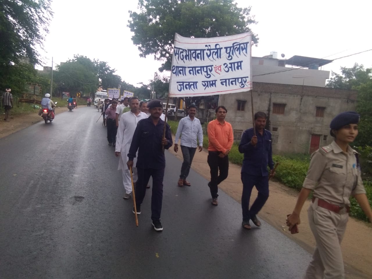 आज नानपुर थाने में सभी समाज के वर्ग व ग्राम रक्षा समिति ने मीडिया कर्मी के साथ सद्भावना रैली निकाली गई। अयोध्या प्रकरण फैसला एवं आगामी त्यौहार को मद्देनजर रखते हुए थाना नानपुर स्टाफ उपस्थित ग्राम चौकीदारों व नगर के गणमान्य नागरिकों व नगर के सभी सम्मान जन के साथ नगर के विभिन्न मार्गो जैसे थाना परिषर से दन्त कालोनी, बस स्टेण्ड मस्जिद मोहल्ले से राम चोक होते हुए बड़ चोक कालिका मन्दिर होते हुए पूरे नगर में एकता व भाई चारे के पोस्टर लेकर ग्राम में प्रशासन के साथ ग्रामीण निकले सद्भावना रैली निकालकर लोगों को आपसी भाईचारा एवं सौहार्द्र बनाए रखने का संदेश दिया गया।