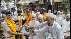 नगर के चौराहों पर मुस्लिम समाज व बोहरा समाज के द्वारा पुष्पमाला व स्वल्पाहार से जगह जगह स्वागत किया गया।