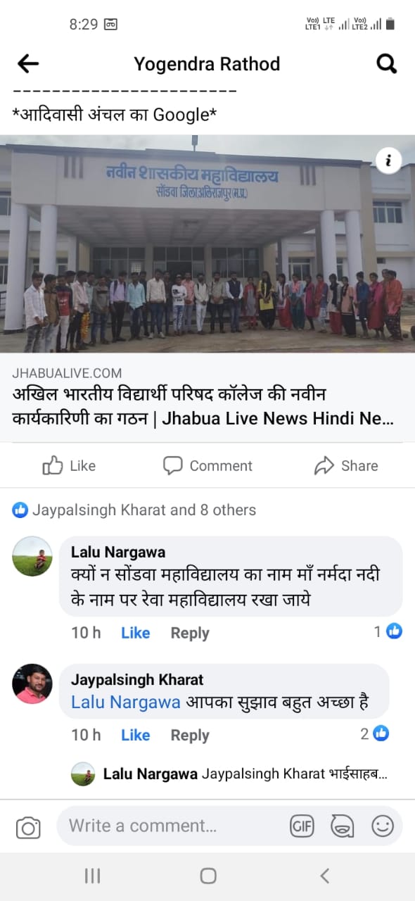 सोंडवा तहसील मुख्यालय पर स्थित नवीन शासकीय महाविद्यालय का नामकरण अंचल की जीवन दायनी मां नर्मदा नदी के नाम पर मां नर्मदा महाविद्यालय करने का सुझाव लोगो ने Facebook पर कमेंट कर दिया है ।जिसका समर्थन भाजपा के सोंडवा मंडल अध्यक्ष जयपाल सिह खरत ने भी किया है । झाबुआ-अलीराजपुर live भी इसका समर्थन करता है कि अंचल की जीवनदायनी नदी मां नर्मदा के नाम पर शासकीय महाविद्यालय का नामकरण होना चाहिए। अलीराजपुर लाइव से हुई बातचीत में सोण्डवा मंडल अध्यक्ष जयपालसिंह खरत द्वारा बताया गया कि उक्त मांग जिले के प्रभारी मंत्री,सांसद एवं मुख्यमंत्री के प्रस्तावित जोबट दौरे पर उनके सम्मुख रखी जाएगी।