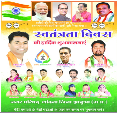 स्वतंत्रता दिवस की सभी जिलेवासियों, प्रदेशवासियों को हार्दिक बधाई… शुभकामनाएं सौजन्य-नगर परिषद थांदला जिला झाबुआ