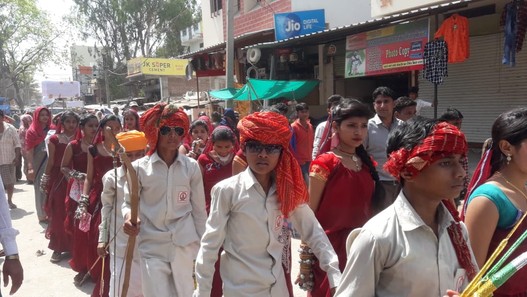 उमराली /अलीराजपुर- उमराली हाट बाजार में आये ग्रामीणो एवं व्यापारीयो को मतदान के संदेश को पहुचाने के लिए स्कुली छात्रों द्वारा भोगर्या ऩृत्या के माध्यम से ग्रामीण क्षैत्र की जनता में लोक सभा निर्वाचन 2019 देश के लोकतंत्र में अपनी भागीदारी सुनिश्चित करने एवं शतप्रतिशत मतदाताओ को मतदान के प्रति अपने कर्तव्य एवं अपने मत के अधिकार के महत्व को समझाने के लिए जिला निर्वाचन अधिकारी एवं कलेक्टर शमीम उददीन तथा स्वीप प्लान के नोडल अधिकारी राजेश कुमार जैन के निर्देशन में तथा सहायक आयुक्त् मीना मण्डलोई एवं जिला शिक्षा अधिकारी विनोद कुमार कौरी के मार्ग में विकास खण्ड सोण्डवा के साप्ताहिक हाट बाजार उमराली में स्कूली छात्रो के द्वारा भोंगर्या लोक ऩृत्य के माध्यनम से ग्रामीणो को शतप्रतिशत मतदान प्रक्रिया में भाग लेने तथा मतदान कराने के लिए बालक/कन्याा मा0वि0 उमराली, हायर सेकण्ड्री स्कु्ल एवं एकलव्या आदर्श वि0 के छात्रो द्वारा भोंगर्या नृत्य- के माध्यम से हाट बाजार में आये ग्रामीणो को ऩृत्या कर अपनी ओर आकर्षित करते हुए सभी को मतदान करने के लिए अपने कर्तव्य एवं अपने मतदाधिकार के उपयोग को 19 मई 2019 को अनिवार्यत : करने के‍ लिए प्रेरित किया । कार्यक्रम की हाट बाजार में उपस्थित व्यापारीयो एवं ग्रामीणों ने कार्यक्रम की प्रशंसा करते हुए उपस्थित जनों ने ऩृत्य् का आनंद उठाया । भोंगर्या नृत्य दल एवं रैली का प्रारंभ एकलव्य आदर्श वि0 उमराली स्कूल प्रांगण से प्रारंभ कर मेन बाजार होते हुए छोटीवेगलगांव रोड तथा वहां से सोण्डवा रोड होते हुए पुन: एकलव्य आदर्श वि0 उमराली में वहां पर मुख्य अतिथि बीआरसी भंगुसिंह तोमर ने कार्यक्रम‍ को सम्बो्धित करते हुए कहां की प्रत्येक मतदाता को अनिवार्यत: मताधिकार का उपयोग करने के लिए प्रेरित किया साथ मतदान के दिन अनिवार्यत: अपनी सहभागिता सुनिश्चित करने के लिए तथा जिनका नाम मतदाता सूची मे है उन्हे मतदान कराने की शपथ दिलाई । इस अवसर पर मधुबाला शर्मा सहायक परियोजना समन्वयक जेण्डर सर्वशिक्षा अभियान अलीराजपुर, एकलव्य आदर्श वि0 के प्राचार्य सुनिल दुबे, हासे के प्रभारी प्राचार्य केशरसिंह चौहान, बीएसी रायसिंह अवास्या्, कलसिंह डावर, कमावि के शाला प्रभारी सिलोमित रावत, शिक्षक गुलाबसिंह भिण्डें, पुर्णिमा व्यास, झेतरसिंह वास्केल, बीएलओ विकास राठौड, मेकसिंह कटारा, हेमलता बन्दौमड , मानकर सस्तिया, कालू डोडवा, दुरसिंह भिण्डे्, पीसीओ मोहनसिंह जमरा, पंचायत सचिव खुमानसिंह तोमर, सहायक सचिव कलमसिंह सस्तिया एवं छात्रवास अधिक्षिक विरेन्द्रसिंह रावत सहित संकुल केन्द्र उमराली के समस्त शिक्षक शिक्षिकाए एवं छात्र उपस्थित रहे । कार्यक्रम का संचालन जनशिक्षक मुवासिया डावर एवं आभा