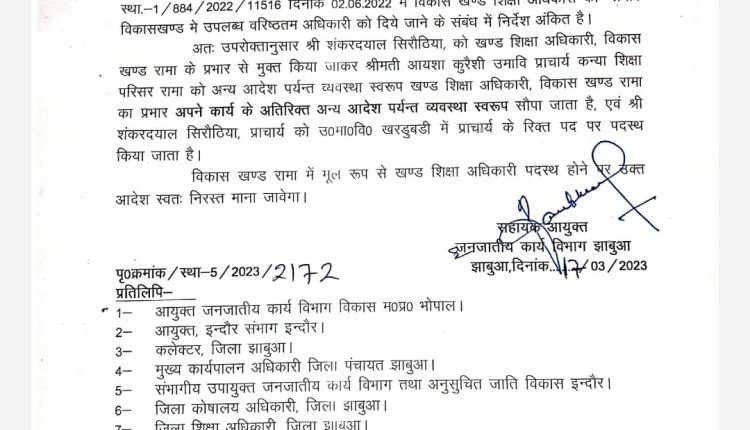 आज झाबुआ कलेक्टर ने एक आदेश जारी कर विगत 17 मार्च को रामा BEO का चार्ज लेने वाली आयशा सैयद कुरैशी को हटाकर शासकीय उच्चतर माध्यमिक विद्यालय रामा के व्याख्याता के एल परमार को रामा BEO नियुक्त किया है।