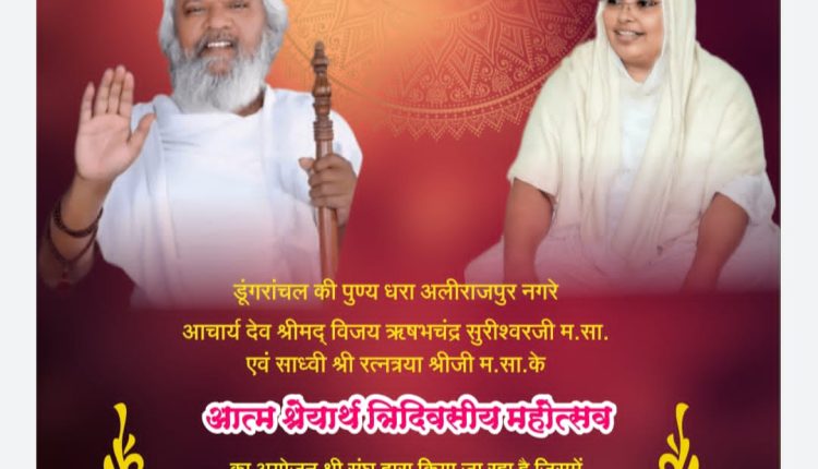 अलीराजपुर। प्रातः स्मरणीय दादा गुरुदेव श्रीमद् विजय राजेंद्रसूरीजी महाराज साहेब पाट परंपरा के आचार्य श्रीमद् विजय ऋषभचंद्र सूरीश्वरजी महाराज साहेब एवं साध्वी श्री रत्नात्रया श्री जी महाराज साहेब के आत्मश्रेयार्थ त्रिदिवसीय महोत्सव आज 11 अप्रैल से विभिन्न आयोजनों के साथ प्रारंभ हुआ।