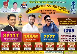 चंद्रशेखर आजाद नगर में राॅयल क्लब के तत्वावधान में रात्रिकालीन प्लास्टिक बॉल किक्रेट का आयोजन शुक्रवार रात्रि में कांग्रेस नेता सुरपाल अजनार की मुख्य अतिथि में प्रारम्भ हुआ। छोटा उदयपुर ओर जयसवाल क्लब के बीच उद्घाटन मैच खेला गया।