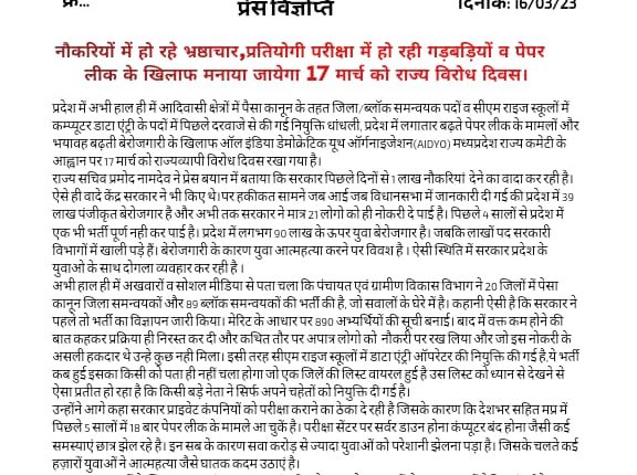 प्रदेश में अभी हाल ही में आदिवासी क्षेत्रों में पैसा कानून के तहत जिला/ब्लॉक समन्वयक पदों व सीएम राइज स्कूलों में कम्प्यूटर डाटा एंट्री के पदों में पिछले दरवाजे से की गई नियुक्ति धांधली, प्रदेश में लगातार बढ़ते पेपर लीक के मामलों और भयावह बढ़ती बेरोजगारी के खिलाफ ऑल इंडिया डेमोक्रेटिक यूथ ऑर्गनाइजेशन(AIDYO) मध्यप्रदेश राज्य कमेटी के आह्वान पर 17 मार्च को राज्यव्यापी विरोध दिवस रखा गया है।