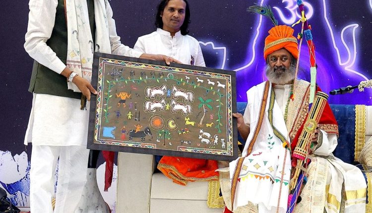 3 दिवसीय इंदौर दौरे पर आए श्री श्री रविशंकर महाराज जी को भेंट की आदिवासी सभ्यता की परंपरागत प्रतीकात्मक पिथौरा चित्रकला