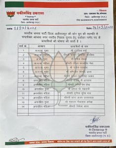 भारतीय जनता पार्टी जिला अलीराजपुर की कोर ग्रुप की सहमति से चन्द्रशेखर आजाद नगर नगरीय निकाय चुनाव हेतु वार्डवार पार्षद पद के प्रत्याशियों की घोषणा की गई। 15 वार्ड में से वार्ड क्रमांक 15 को होल्ड पर रखा है। देखिए भाजपा के 14 वार्ड के अधिकृत प्रत्याशियों की सूची…