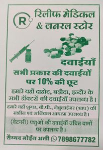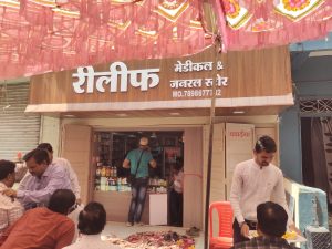 चन्द्रशेखर आज़ाद नगर में रिलीफ़ मेडिकल & जनरल स्टोर का कैबिनेट मंत्री माधौसिंह डावर व जनपद अध्यक्ष इंदरसिंह डावर, नगर परिषद अध्यक्ष निर्मला डावर ने नया बाजार में फीता काटकर उद्धघाटन किया।