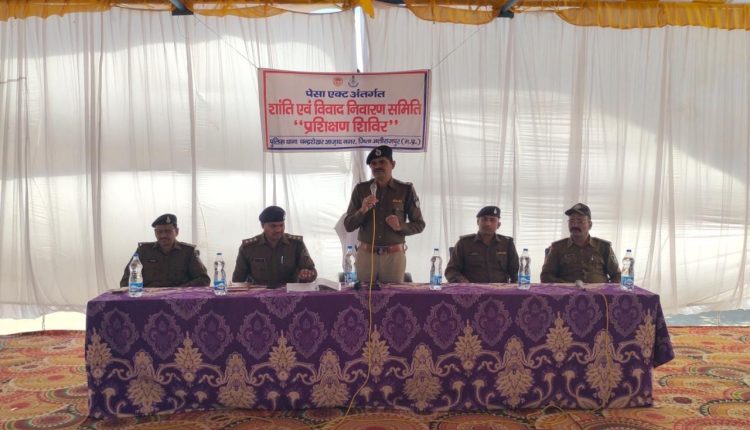 मध्यप्रदेश शासन द्वारा लागु पेसा एक्ट के तहत जिले के प्रत्येक थानों में शांति एवं विवाद निवारण समिति गठित की गई है। जिसे ग्राम में होने वाले आपसी झगड़ों में समझौता करने के लिए इन समितियों को 22 फरवरी को चंद्रशेखर आजाद नगर के मंडी परिसर में प्रशिक्षण दिया गया। आयोजन पुलिस अधीक्षक मनोज कुमार सिंह निर्देशानुसार किया गया। इस दौरान पुलिस अधिकारियों ने समिति सदस्यों को संबोधित किया। पेसा एक्ट के बारे में विस्तार से जानकारी भी दी गई।