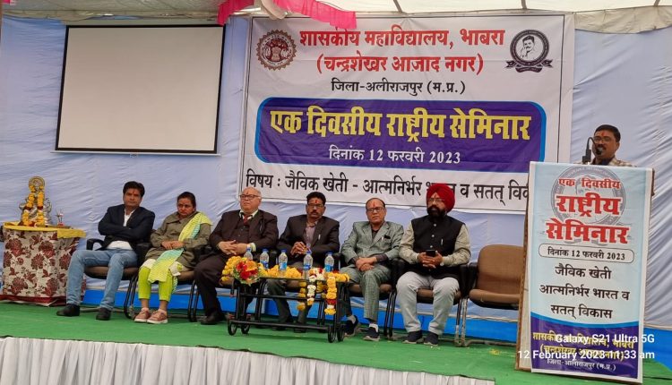 शासकीय महाविद्यालय भाबरा चंद्रशेखर आजाद नगर में विश्व बैंक परियोजना के तहत एक दिवसीय राष्ट्रीय सेमिनार  का आयोजन शीर्षक- “जैविक खेती: आत्मनिर्भर भारत एवं सतत विकास” पर प्राचार्य डॉ. सरदार सिंह डोडवे के मार्गदर्शन में किया गया। प्राचार्य द्वारा अपने अध्यक्षीय भाषण में कहा कि हमारा जिला कृषि आधारित व्यवस्था पर निर्भर है, वर्तमान में कई प्रकार के कीटनाशक तथा रासायनिक उर्वरकों का प्रयोग किया जाता है जिसका प्रभाव मानव स्वास्थ्य पर पड़ता है, उससे बचने के लिए जैविक खेती की ओर हमें फिर से अग्रसर होना चाहिए और यही सेमिनार का मुख्य उद्देश्य है। कार्यक्रम के मुख्य अतिथि शहीद चंद्रशेखर आज़ाद स्नातकोत्तर महाविद्यालय झाबुआ के प्राचार्य डॉ. जगदीश चंद्र सिन्हा, विशेष अतिथि माँ नर्मदा शासकीय महाविद्यालय सोंडवा के प्राचार्य डॉ. भूपेंद्र तिवारी, विशिष्ट अतिथि शहीद चंद्रशेखर शासकीय स्नातकोत्तर महाविद्यालय के प्रशासनिक अधिकारी डॉ. रविंद्र सिंह रहे। सेमिनार में आमंत्रित  सम्मानित वक्ता डॉ. बी आर अंबेडकर सामाजिक विश्वविद्यालय महू से डॉ. दीपक कुमार वर्मा, माधव विश्वविद्यालय राजस्थान से डॉ. आशा राणा व कृषि विज्ञान केंद्र अलीराजपुर के वरिष्ठ वैज्ञानिक डॉ. राकेश कुमार यादव उपस्थित थे।