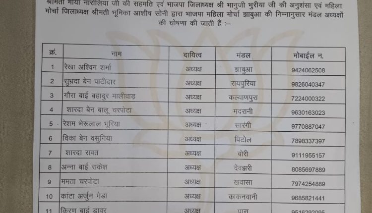 भाजपा महिला मोर्चा झाबुआ की कार्यकारिणी की घोषित, पढ़िए किसे क्या जिम्मेदारी मिली