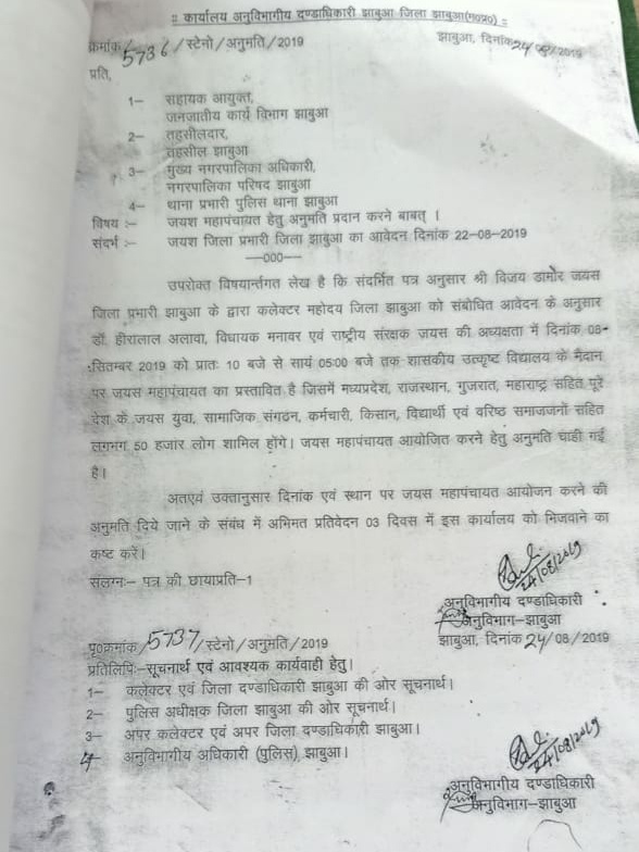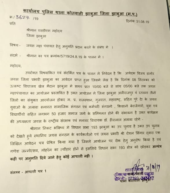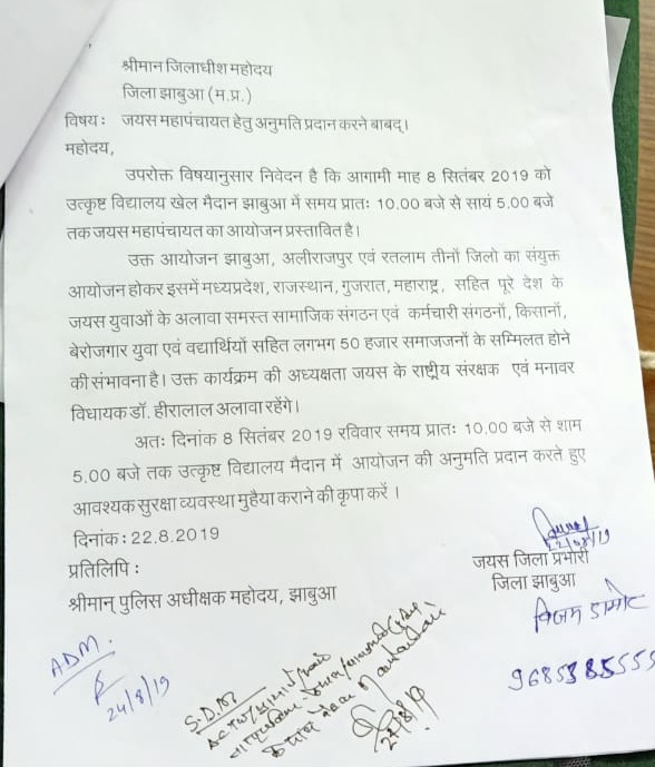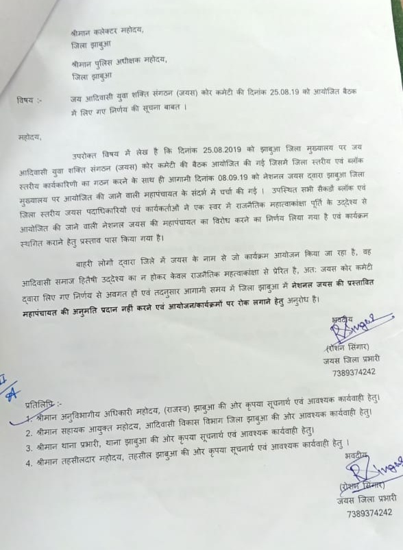 दरअसल पूरे मामले में विवाद इसलिए गहराया है कि जयस के जिला प्रभारी विजय डामोर ने 24 अगस्त को कलेक्टर के नाम पत्र एडीएम झाबुआ को सौंपा था, जिसमें 8 सितंबर 2019 को झाबुआ के उत्कृष्ट विद्यालय मैदान में सुबह 10 बजे से लेकर शाम 5 बजे तक 50 हजार समाजजनों के साथ आदिवासी महापंचायत करने की अनुमति मांगी गई थी। इसके विरोध में जयस कोर कमेटी के रोशन सिंगार ने एक आवेदन झाबुआ कलेक्टर-एसपी को दिया, जिसमें कहा गया है कि वे ही असली जयस हैं तथा 25 अगस्त को झाबुआ में जयस कोर कमेटी की बैठक कर उनके संगठन के द्वारा यह तय किया गया है कि कुछ जयस कार्यकर्ताओं एवं पदाधिकारियों ने राजनीतिक महात्वाकांक्षा के चलते झाबुआ में आदिवासी महापंचायत का एलान किया है, जो कि बाहरी लोग हैं, तथा उनका उद्देश्य राजनीतिक है तथा उन्हें आदिवासी महापंचायत करने की अनुमति न दी जाए। इस पत्र में दिनांक का उल्लेख नहीं है, इस पत्र के बाद झाबुआ के एसडीएम ने पुलिस कोतवाली झाबुआ से उनका अभिमत मांगा, जिसके जवाब में अपने पत्र क्रमांक 3627/19 दिनांक 31 अगस्त 2019 के जरिये थाना प्रभारी ने अपना अभिमत तो नहीं दिया, लेकिन शिकायतकर्ता रोशन सिंगार के पत्र का हवाला देते हुए लिखा की निकट भविष्य में विधानसभा क्रमांक 193 झाबुआ का उपचुनाव हैं, उक्त उपचुनाव को देखते हुए जयस कार्यकर्ताओं एवं जयस प्रभारी रोशन सिंगार ने पत्र दिया है। थाना प्रभारी ने यह भी लिखा कि गणेशोत्सव, मोहर्रम व आगामी विधानसभा उपचुनाव को देखते अन्यत्र स्थान पर अनुमति दी जाए।