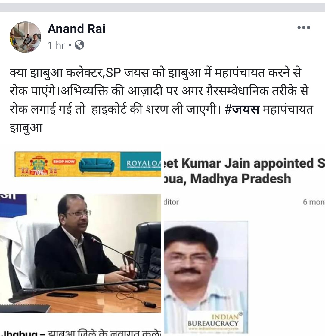 इस पूरे मामले में अब जयस जिला झाबुआ प्रशासन को टारगेट करता दिख रहा है। जयस प्रमुख हीरालाल अलावा ने जहां कांग्रेस की कमलनाथ सरकार से इस मुद्दे पर बगावत करने की चेतावनी दी है, वहीं जयस के थिंक टैंक माने जाने वाले डॉ. आनंद राय ने भी अनुमति न देने के मुद्दे पर एसपी-कलेक्टर की फोटो लगाकर फैसबुक पर हाईकोर्ट के समक्ष जाने के संकेत दिए हैं।
