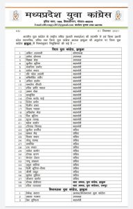 भारतीय युवा कांग्रेस के राष्ट्रीय सचिव (प्रभारी मप्र) की सहमति एवं जिला प्रभारी, प्रदेश महासचिव, तथा जिला युवा कांग्रेस के अध्यक्ष झाबुआ की अनुशंसा मध्यप्रदेश युवा कांग्रेस अध्यक्ष झाबुआ की अनुशंसा पर जिला युव कांग्रेस झाबुआ में नियुक्तियां की गई है जो निम्नप्रकार से है-