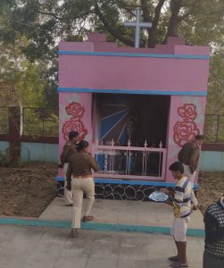 झाबुआ जिला मुख्यालय से 11 किमी दूर कल्याणपुरा पुलिस थाना के तहत आने वाले ग्राम पिपलिया ईशगढ़ गांव में आज दोपहर उस समय सनसनी फैल गई जब चर्च परिसर में स्थित मदर मरियम की प्रतिमा से अचानक धुआं उठना शुरू हो गया उसके बाद आसपास के रहवासी मौके पर पहुंचे तो उन्होंने देखा कि मूर्ति एक हिस्सा एवं जिस मंदिर में मूर्ति थी उसका एक हिस्सा काला पड़ चुका था। आनन-फानन में पुलिस को इसकी सूचना दी गई। सूचना मिलते ही एसपी विनीत जैन ने प्रभारी एसडीओपी मनोहरसिंह मंडलोई के साथ पुलिस बल भी मौके पर भेजा। प्रारंभिक जांच में गांव के रहवासी महिला ग्रेसी तथा उसकी एक सहेली ने पुलिस को बताया कि एक 17 वर्षीय किशोर को माता मरियम की मूर्ति में धुआं उठने के कुछ देर पहले पेट्रोल की कैन लेकर चर्च परिसर की ओर जाते देखा था। पुलिस ग्रेसी के बयान के इस आधार पर अब यह पता लगा रही है कि हाथों में पेट्रोल की कैन लेकर आया किशोर युवक कौन था? पुलिस आसपास के पेट्रोल पंपों के सीसीटीवी फुटेज खंगाल रही है। साथ ही खुलेे में पेट्रोल बेचने वाले लोगों से भी पूछताछ हो रही है। इस मामले की एफआईआर कल्याणपुरा थाना अंतर्गत आने वाली अंतरवेलिया पुलिस चौकी पर दर्ज करवाई गई है। पुलिस ने धारा 295 आयपीसी के तहत अज्ञात व्यक्तियों के खिलाफ मामला दर्ज कर लिया है। इस संबंध में कैथोलिक डायसिस झाबुआ के प्रवक्ता फादर रॉकी शाह ने बताया कि अंचल में पूरी तरह से शांतिपूर्ण माहौल है और इस शांतिपूर्ण माहौल में इस तरह की घटना हैरानी भरी है। हमें पुलिस पर पूरा भरोसा है और हमें उम्मीद है कि पुलिस मामले के आरोपी या आरोपियों तक जल्द पहुंचेगी। मौके पर पहुंचे एसडीओपी मनोहरसिंह मंडलोई ने बताया कि प्रारंभिक जानकारी में किसी किशोर के पेट्रोल की कैन लेकर चर्च कैंपस की तरफ आने की सूचना है, और हम इसी सूचना पर जांच कर रहे हैं। वहीं एसपी विनीत जैन ने घटना की पुष्टि करते हुए कहा कि पुलिस तेजी से मामले की जांच में जुट गई है, स्थिति सामान्य है और पिपलिया के ग्रामीण भी पुलिस को सहयोग रहे हैं, जल्द ही हम आरोपी तक पहुंचेंगे।