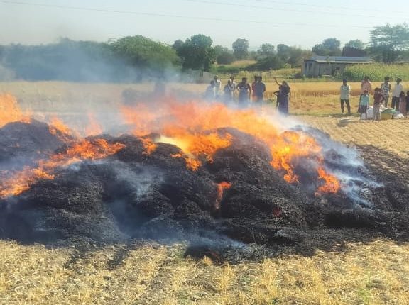 खेत में कटे हुए गेहूं के ढेर पर अज्ञात कारणों से लगी आग, किसान का हजारों रुपए का नुकसान