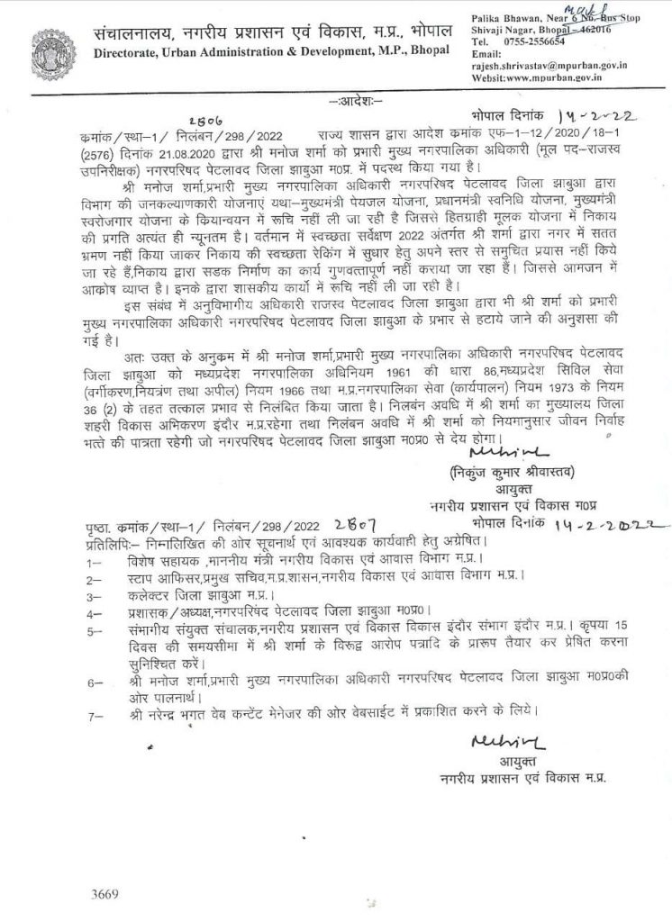 आदेश में बताया गया कि पेटलावद सीएमओं मनोज शर्मा द्वारा विभाग की जनकल्याणकारी योजनाएं यथा-मुख्यमंत्री पेयजल योजना, प्रधानमंत्री स्वनिधि योजना, मुख्यमंत्री स्वरोजगार योजना के कियान्वयन में रूचि नहीं ली जा रही है जिससे हितग्राही मूलक योजना में निकाय की प्रगति अत्यंत ही न्यूनतम है। वर्तमान में स्वच्छता सर्वेक्षण 2022 अंतर्गत श्री शर्मा द्वारा नगर में सतत भ्रमण नहीं किया जाकर निकाय की स्वच्छता रेकिंग में सुधार हेतु अपने स्तर से समुचित प्रयास नहीं किये जा रहे हैं। निकाय द्वारा सडक निर्माण का कार्य गुणवत्तापूर्ण नहीं कराया जा रहा हैं। जिससे आमजन में आक्रोश व्याप्त है। इनके द्वारा शासकीय कार्यों में रूचि नहीं ली जा रही है। इस संबंध में खुद पेटलावद के एसडीएम आईएएस शिशिर गेमावत ने सीएमओं को प्रभार से हटाये जाने की अनुशसा की गई है। इसी के चलते सीएमओं मनोज शर्मा को मध्यप्रदेश नगरपालिका अधिनियम 1961 की धारा 86, मध्यप्रदेश सिविल सेवा (वर्गीकरण,नियत्रंण तथा अपील) नियम 1966 तथा म.प्र.नगरपालिका सेवा (कार्यपालन) नियम 1973 के नियम 36 (2) के तहत तत्काल प्रभाव से निलंबित किया जाता है। निलबंन अवधि में सीएमओं का मुख्यालय जिला शहरी विकास अभिकरण इंदौर म.प्र.रहेगा तथा निलंबन अवधि में मनोज शर्मा को नियमानुसार जीवन निर्वाह भत्ते की पात्रता रहेगी जो नगरपरिषद पेटलावद से देय होगा।