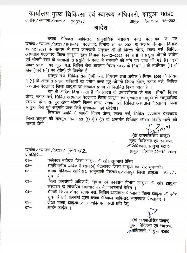 आज सोमवार को सीएमएचओं ने एक आदेश जारी किया। आदेश में बताया गया कि पेटलावद के बीएमओ से प्राप्त पत्र के बाद सिविल अस्पताल पेटलावद की स्टाफ नर्स श्रीमती किरण तोमर द्वारा 18 दिसंबर की रात में प्रसुता श्रीममती संतोश व श्रीमती रेखा के परिजनों से प्रसुति के एवज में धनराशि की मांग कर प्राप्त की गई थी। इस प्रकार इनका कृत्य मप्र सिविल सेवा आचरण नियम 1965 के नियम 3 के उपनियम (1) के खण्ड (एक) (दो) एवं (तीन) के विपरीत है। अतः मप्र सिविल सेवा (वर्गीकरण, नियंत्रण एवं अपील) नियम 1966 के नियम 9(1) के अंतर्गत प्रदत्त शक्तियों का प्रयोग करते हुए स्टाफ नर्स श्रीमती किरण तोमर को तत्काल प्रभाव से निलंबित किया जाता है। इसके साथ ही आदेष में यह भी निर्देषित किया कि आदेश के प्रभावशिलता के मध्य श्रीमती किरण तोमर का मुख्यालय सामुस्वाके राणापुर रहेगा। नर्स बिना पूर्व अनुमति प्राप्त किए मुख्यालय नही छोड़ेगी।