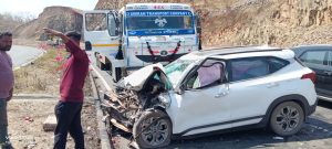 शनिवार दोपहर करीब 12:30 बजे इंदौर से गुजरात की ओर जा रही एक तेज रफ्तार कार (CG 05 AP 6400) घाट के उतार पर अनियंत्रित होकर दूसरी लेन से आ रहे ट्राले में जा घुसी। हादसे में कार का अगला हिस्सा बुरी तरह क्षतिग्रस्त हो गया, लेकिन गनीमत रही कि सवार लोगों को गंभीर चोटें नहीं आईं।