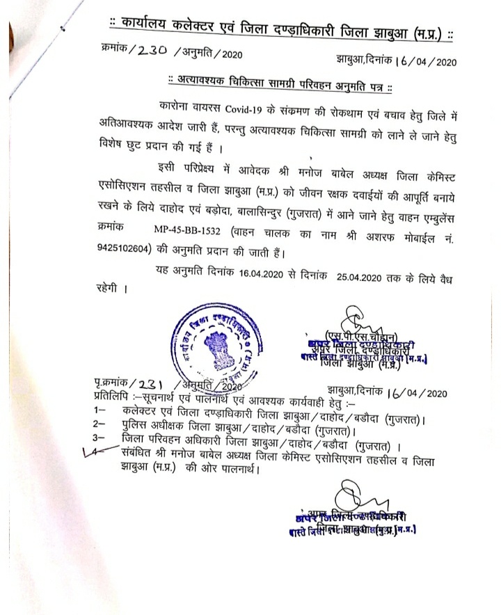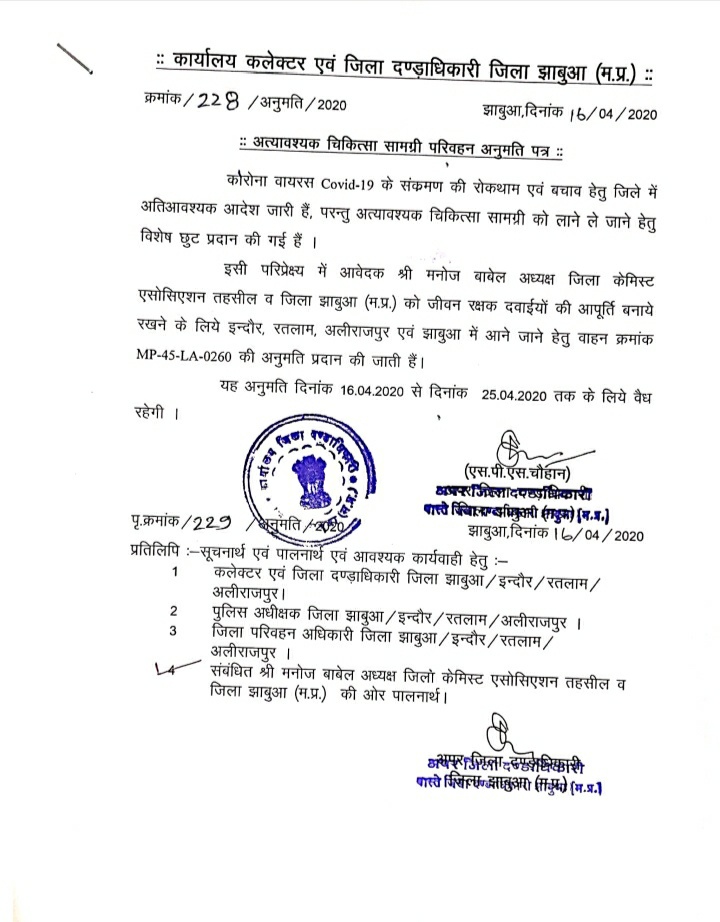 कोरोना वायरस के बढ़ते असर के कारण हर कोई अपने घर में बंद हो गया है। हालांकि, अभी लोगों में इस बात की चिंता है कि अगले 19 दिन अपनी जरूरी दवाइयां जो अन्य राज्यो व जिलों से मंगाते थे वो कैसे लाई जाए, तो ऐसे में कोरोना की बीमारी का सामना करने, जरूरत की दवाइयां मंगाने के लिए कई तरह की सुविधाएं की जिले में भी की गई है, जिससे आने वाले दिनों में कोई दिक्कत नहीं आएगी। कलेक्टर प्रबल सिपाहा ने जरूरी दवाइयों की आपूर्ति बनाये रखने के लिए जिला केमिस्ट एसोसिएशन के जिलाध्यक्ष मनोज बाबेल को इंदौर, रतलाम, आलीराजपुर ओर झाबुआ के लिए अलग वाहन और गुजरात के दाहोद, बड़ोदा, बालसिंदुर के लिये अलग वाहन से जरूरी दवाइयों के लिये अनुमति प्रदान की है। अब आप जिलेवासियों को अगर किसी जरूरी दवाई की जरूरत है तो आप इन्हें आर्डर कर सकते है ये वह जरूरी दवाई आपको देंगे।