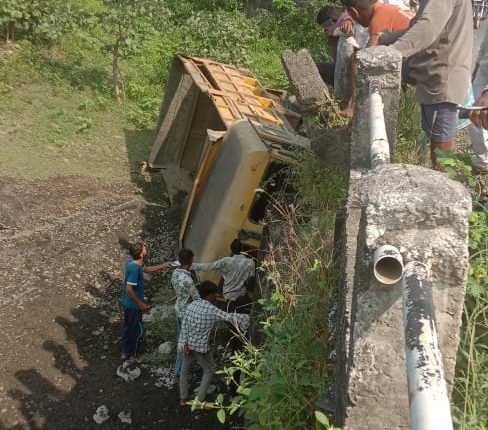 चम्पलिया नदी के पुल से नीचे गिरा गिट्टी से भरा डंपर