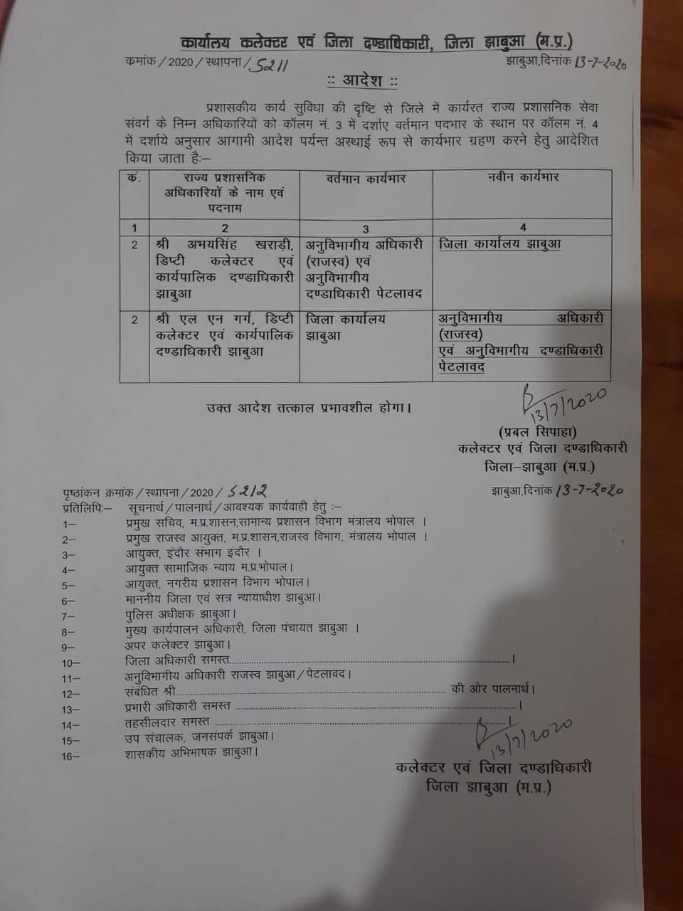 झाबुआ से जिस तरह यहां भेजे गए थे, उससे भी तेज कार्यवाही हो गई। कलेक्टर प्रबल सिपाहा ने डाक्टर अभय खराड़ी की जगह एलएन गर्ग को यहां भेजा है। इससे पहले यह झाबुआ में थे।
